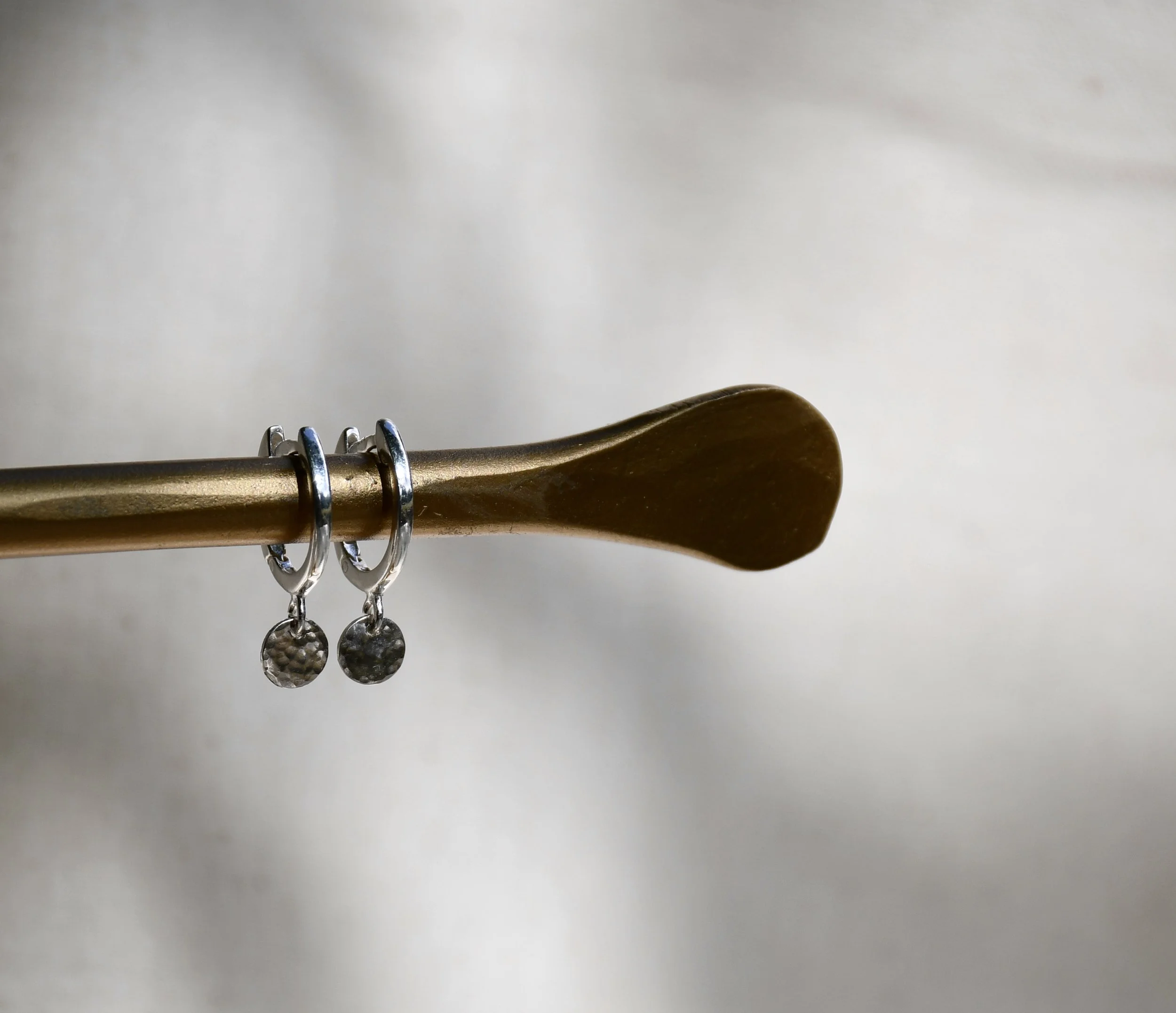 Shop Dappled Silver Huggies £26.00 Silver Domed Earrings £30.00 Mini Silver Hammered Disc Hoops £24.00 Silver Dainty Line Earrings £25.00 Mini Brass Hammered Disc Hoops £18.00
